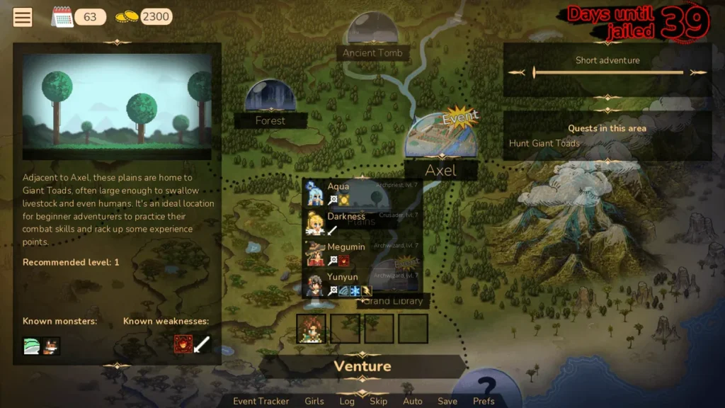 Your party composition matters for adventuring! Taking Megumin means one earth-shattering blast then a long walk home. Bringing Darkness means enemies will have a hard time getting past her, but she might enjoy it a little too much. Experiment! A big part of how to play Adventurer Trainer is finding which chaotic group dynamic works for your style.