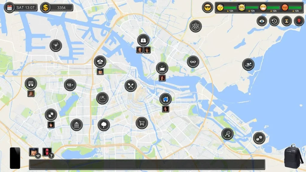 Location is key. The map isn’t huge, but walking takes time. Cluster your actions. If you need to be in the downtown area for the Health Club, check what other errands or encounters can be done there before returning home. Wasting hours walking back and forth is the biggest drain on your progress.